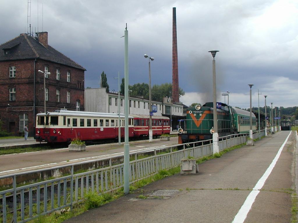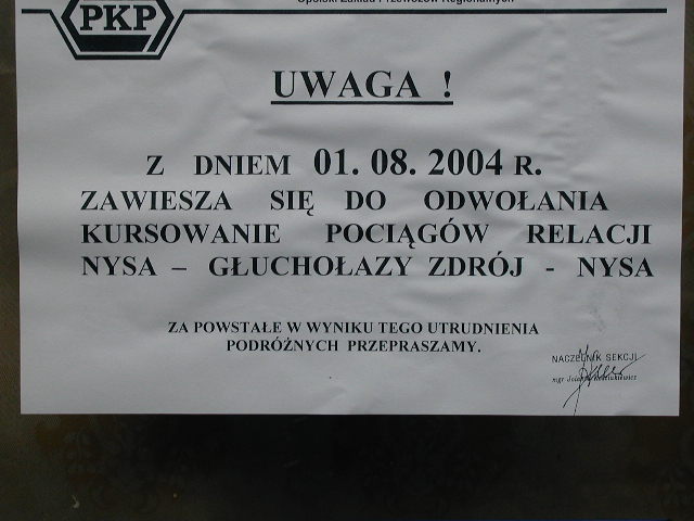 Polsko - Na základě vývěsky v žst. Nysa je od 1.8.2004 zastaven provoz osobních vlaků relace Nysa - Głuchołazy Zdrój. V úseku Nowy Świętów - Głuchołazy Zdrój (trať 206) tak nepojede žádný osobní vlak. Ve stanice Głuchołazy se osobní doprava omezí na obracející české peážní vlaky od Jeseníku na Krnov, ze kterých však nejméně do prosince nadále nebude možný výstup a nástup cestujících. Na snímku z 27.07.2004 jeden z posledních vlaků vedený lokomotivou SM 42 s jedním klasickým vozem ve stanici Nysa, v pozadí zvláštní vlak KŽC.