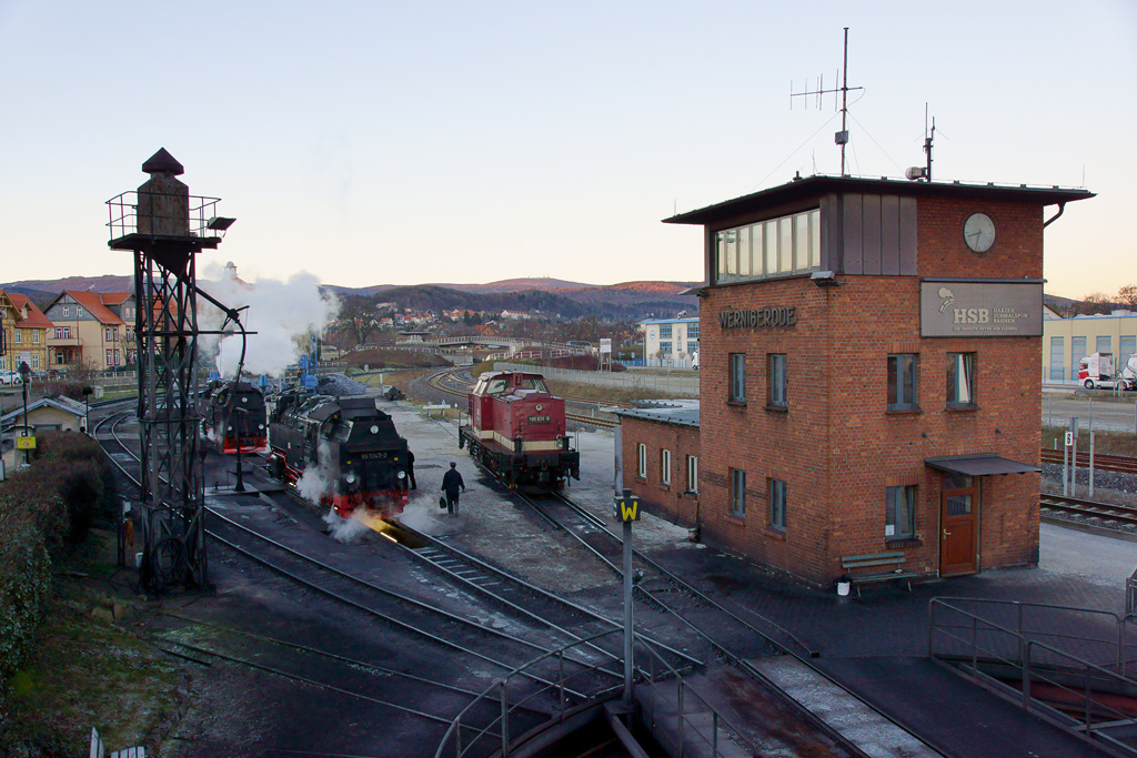 Pochopitelně nás zajímá turistická Brockenbahn. Začíná ve Wernigerode, kde si z lávky prohlížíme výtopnu – točna, země typicky černočerná a mastná, čtyři zatopené lokomotivy, personál v odpovídajícím pracovním oblečení … 2017? Za 39 eur na osobu si kupujeme zpáteční jízdenky, odjíždíme prvním vlakem, který je zcela zaplněn. Trať nejprve vede doslova středem města, přes rušnou křižovatku (zde lze fotit jen v letním období, slunce je v zimě příliš nízko), aby pak v mnoha obloucích v údolí Drängetal vystoupala do stanice Drei Annen Hohne, odkud prudce stoupá na Brocken. I přes značný chlad stojíme na plošině posledního vagónku, lokomotiva supí do kopce… Zážitek! Na Brockenu trávíme celý den, je zde neuvěřitelné množství lidí. Vlaky lze v údolí a na úbočí vrcholu pozorovat velmi dlouho před příjezdem, neboť trať obtáčí celý kopec prakticky v kruhu. Jen se divíme, že i při teplotě pod nulou mašiny téměř nekouří. Kombinace přehřáté páry a nízké vlhkosti okolního vzduchu? Přichází soumrak a s ním očekáváný záběr se sluncem, povedlo se! Do zpátečního vlaku se ani nesnažíme nastoupit, lidé stojí i na přechodových můstcích vozů. Tedy, v takové zimě jet asi hodinu na plošině, brrr… Fotíme poslední vlak, téměř za tmy, zpátky nekompromisně zabíráme místa uvnitř, je to boj. „Ženy a děti první“ už dávno neplatí. Pustil bych alespoň sednout vedle stojící paní, ale kolegův nekompromisní příkaz: „Seď,“ mě vrací do sedačky. V Drei Annen Hohne už za tmy sledujeme dobírání vody.