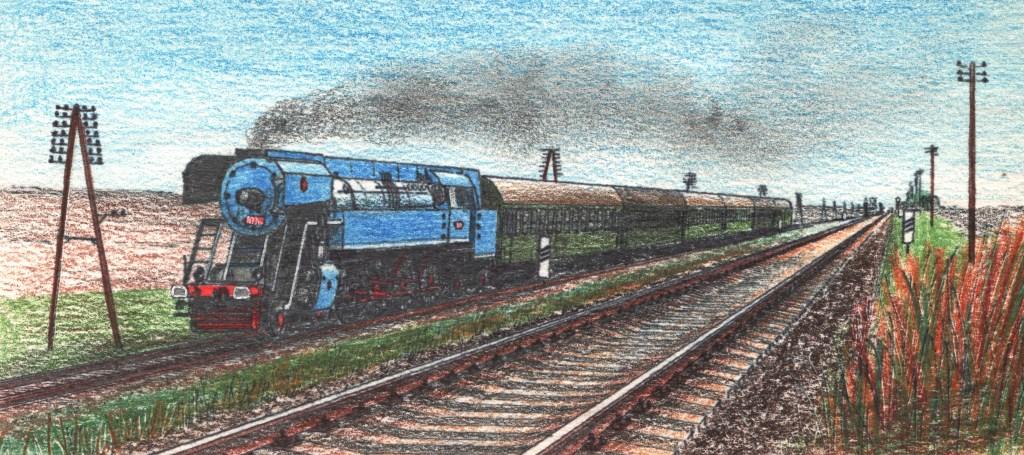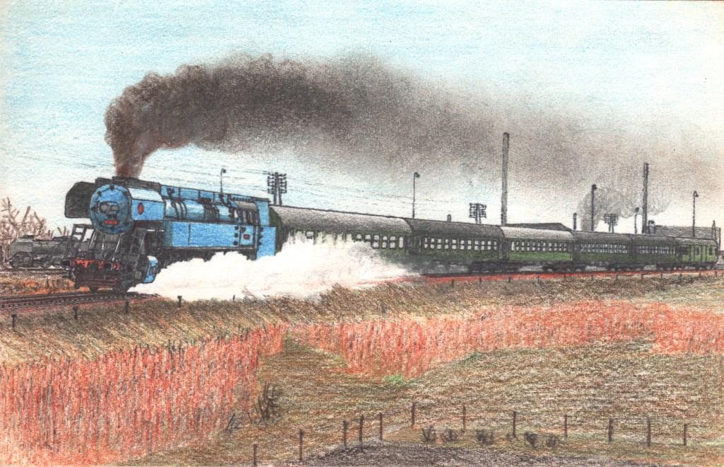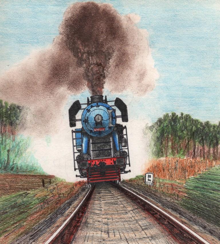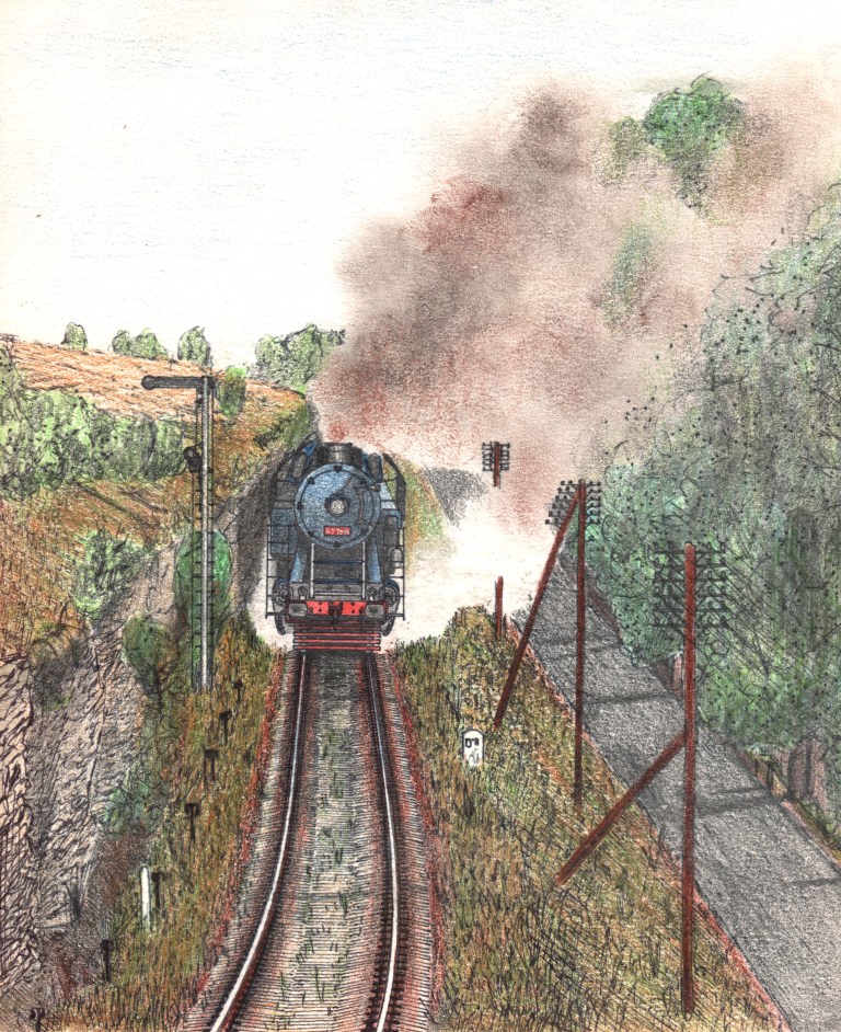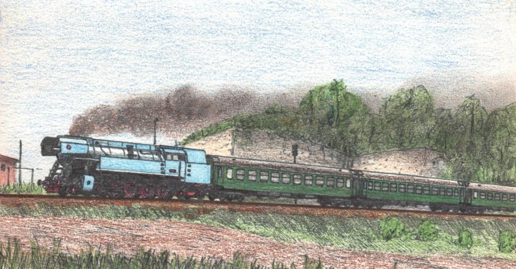 Snad se na mne pánové Maurenz a Šlechta nebudou zlobit, že jsem krásnou fotografii z jejich knížky „Toulky s párou“ před mnoha léty převedl do tužky a pastelek s tím, že místo plzeňské „pětasedmy“ se mi tam zčistajasna objevil lipský „papoušek“. Ale atmosféra oné fotografie, tolik připomínající onen výše opěvovaný „Máchův kraj“, si o takový čin přímo říkala. Kde vlastně přesně je to místo na kresbě, podstatné zase tolik není. Prostě jako kdyby to bylo někde mezi Lípou a Bakovem.