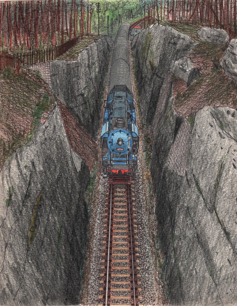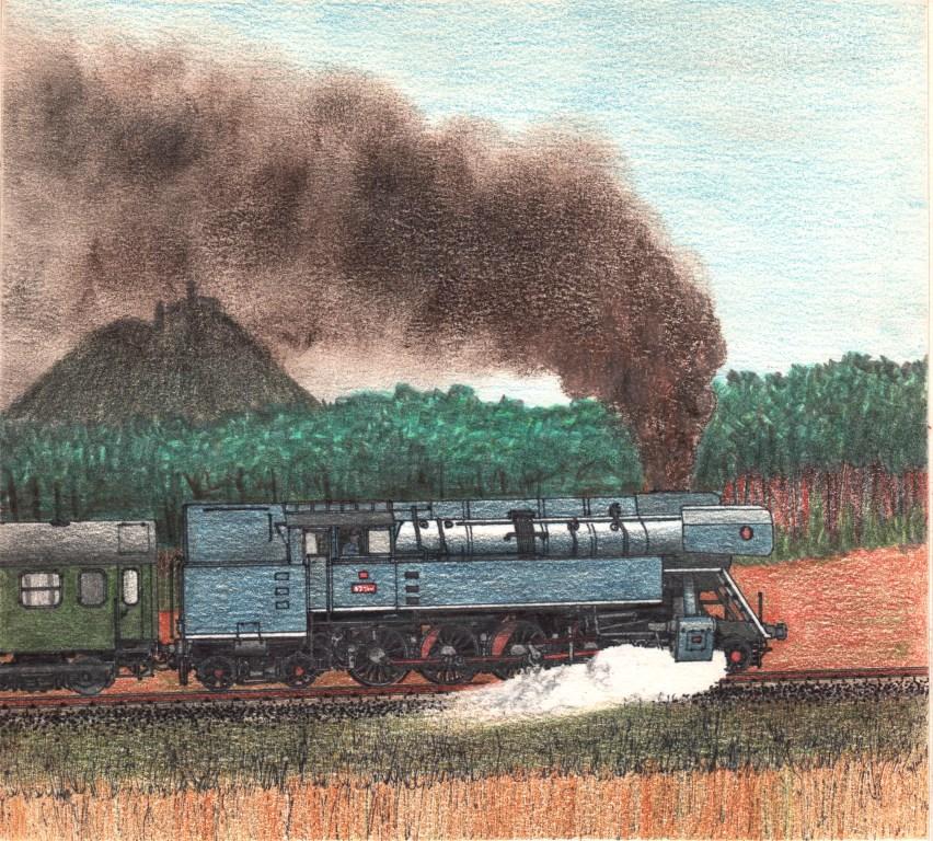 Z Bezdězu dolů si stroj i muži jemu na dosah mohli dát čouda, pouze čas od času bylo potřeba trochu „hrábnout“ průběžnou brzdu, aby se vlak nerozjížděl přes osmdesátku. Naopak, vlaky jezdící opačným směrem to mívaly do Bezdězu horší: z téhle strany bylo stoupání v podstatě třikrát delší, než z okenské strany. Vlak na obrázku s poněkud naivním Bezdězem v pozadí se právě řítí zastávkou Bělá pod Bezdězem město, takřka dokonale posazenou uprostřed toho nejhlubšího lesa. Vždycky jsem si představoval, co by asi tak dělal věci neznalý cestující, hodlající zde vystoupit přímo do víru velkoměsta. Na obrázku stojí za povšimnutí, že zatímco lokomotiva a kolej jsou vyvedeny takřka do posledního šroubku či kamínku, překrásné podbezdězské bory jsem odbyl homogenní zelení a ledabylými svislými črty hnědou pastelkou, majícími znamenat kmeny. Inu, fantazie je věc jedna, trpělivost věc druhá. Hlavně když mašina je tak, jak má být.