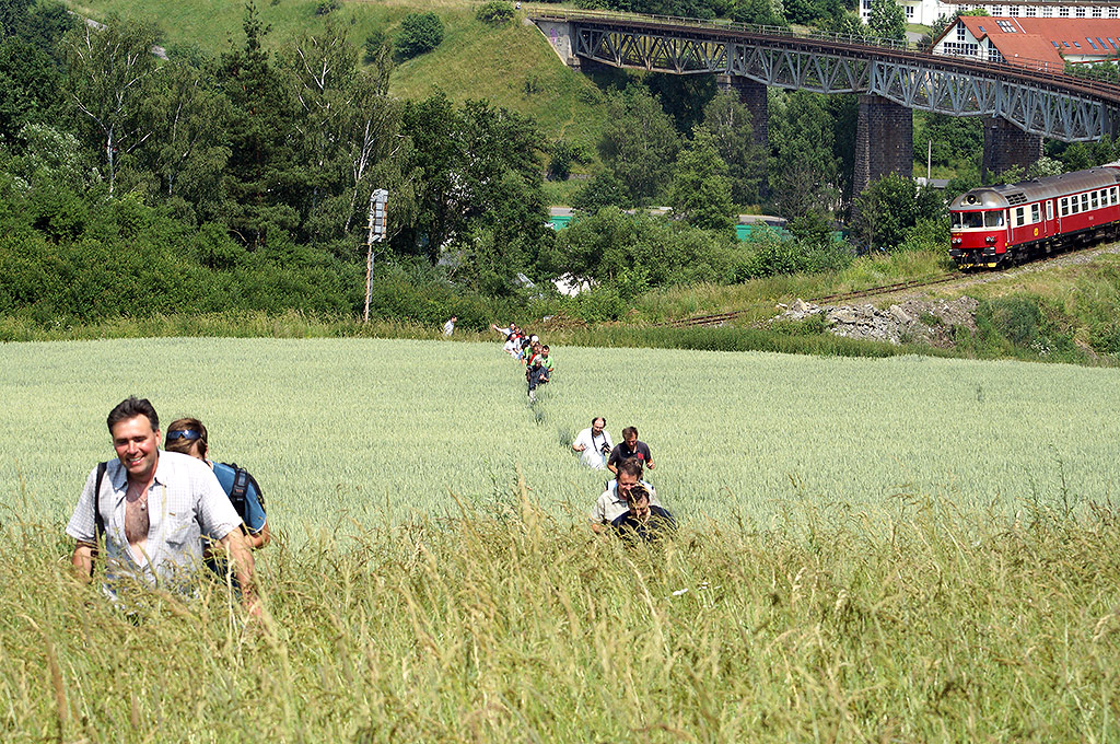HMaH: Ta banda vylezla z hydry a pochoduje na kopec, aby si hydru, která za chvíli couvne až za most a projede po něm znova kolem, vyfotila.