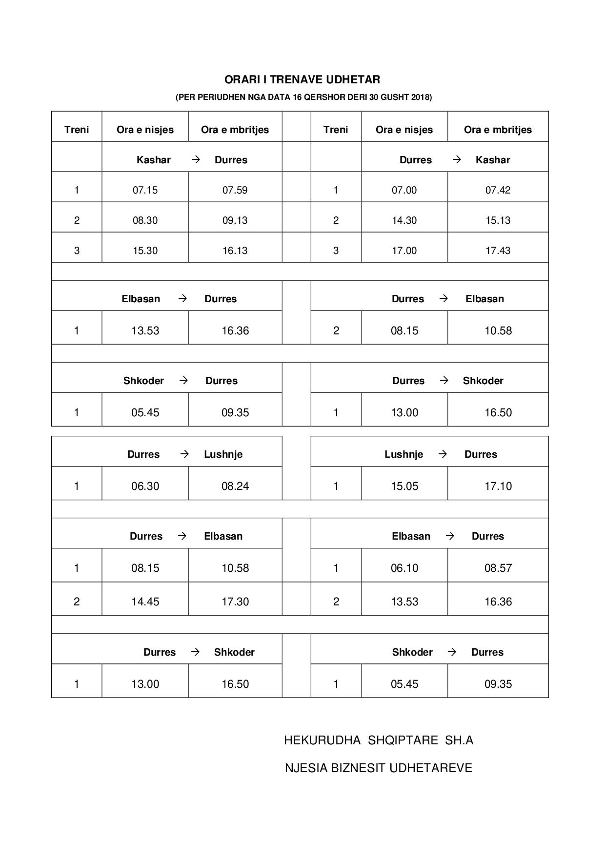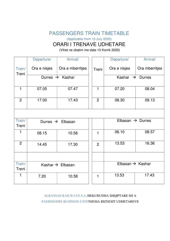 Jízdní řád HSH 2018, foto: HSHOsobní doprava byla zastavena dne 9. 11. 2019. Důvodem byl opět nedostatek financí na nákup motorové nafty. Dne 26. 11. 2019 navíc Albánii postihlo silné zemětřesení, které poničilo trať do Shkodëru. Před tímto zastavením byl provoz po několik let poměrně stabilní. Naposled byl zastaven na podzim roku 2016, nicméně v zimě 2017 se vlaky opět rozjely. Jízdní řád v roce 2018 obsahoval dva páry vlaků Durrës – Elbassan, jeden pár vlaků Durrës – Skhodër, jeden pár vlaků Durrës – Kashar, o letních víkendech pak tři páry. V průběhu roku 2018 začal jezdit jeden pár vlaků Durrës – Rrogozhine, který byl prodloužen do stanice Lushnjë. V létě 2019 byla tato souprava přesměrována na Shkodër, kam zajížděly celé dva páry vlaků denně. Později však byl zrušen úplně.