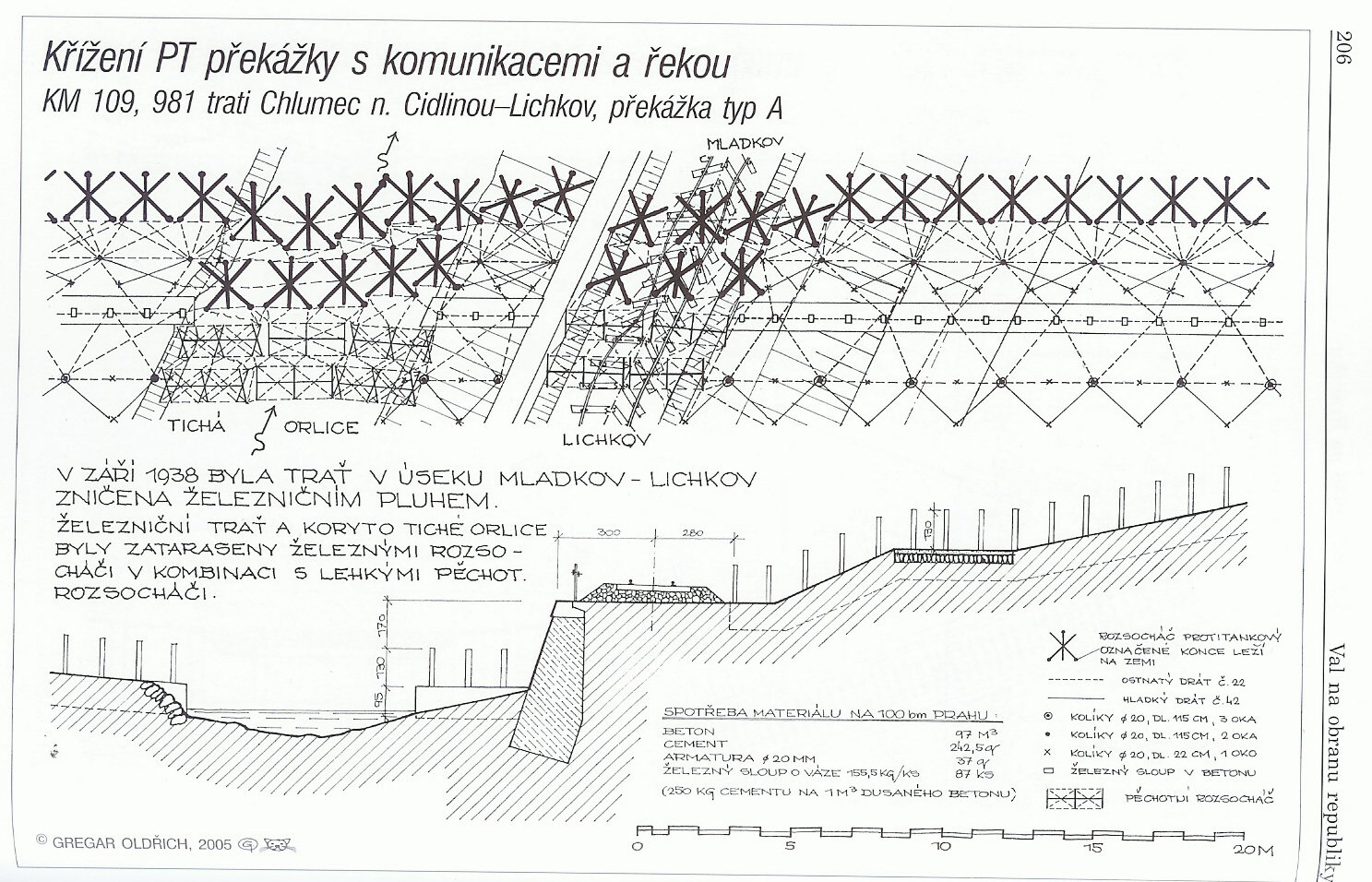 Lichkov - Ve dnech 4. - 7. května 2008 probíhala v rámci rekonstrukce tratě 021 v km 110,0 mezi zastávkou Mladkov a stanicí Lichkov zajímavá operace. Položení nových podélných betonových odvodňovacích žlabů překážela část předválečné protitankové překážky - ve zmíněném místě totiž trať křižuje starou linii těžkého opevnění. Mezi dvěma jejími objekty, konkrétně pěchotními sruby K-S30 a K-S31, byl vybudován typ protitankové intervalové překážky, jejíž součástí byl i v zemi vybetonovaný práh s obdélníkovými otvory, do kterých byly zasouvány ocelové sloupky, tzv. jehly, bránící průjezdu techniky útočníka. Na straně trati ke srubu K-S31 byl práh vybetonován až těsně ke koleji a v místě původního křížení s podélným odvodňovacím příkopem v něm byl zřízen žlábek pro umožnění průtoku vody. Nově položené žlaby jsou ovšem hlubší a práh by v nich působil jako nežádoucí hráz. Díky vstřícnosti investora a zhotovitelů nedošlo k pouhé likvidaci překážející části, ale k jejímu oddělení, rozdělení a odvozu do Muzea Československého opevnění při dělostřelecké tvrzi Bouda a do Vojenského muzea v Králíkách.