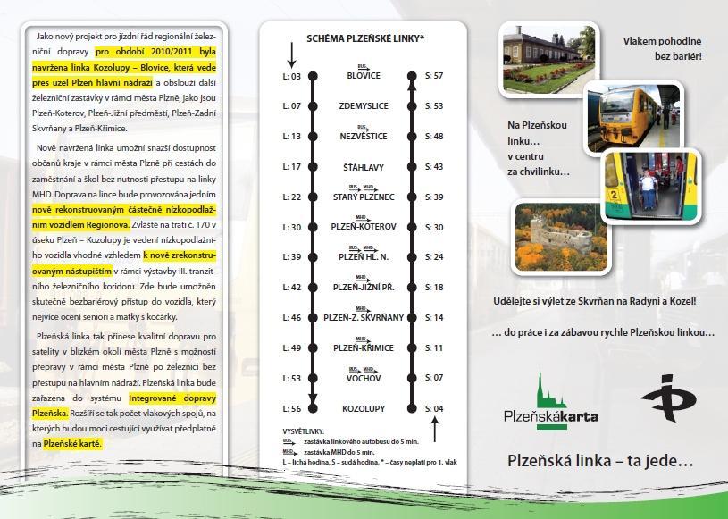 Plzeň — Integrovaná doprava Plzeňska se dočká nového, dosud nevídaného prvku. Plzeňský kraj, objednavatel regionálních vlakových spojů, společně s plzeňským Krajským centrem osobní dopravy (KCOD) Českých drah totiž od začátku nového jízdního řádu 2010/2011 spouštějí první příměstskou železniční linku, vedenou skrz město. V Plzeňském kraji se sice s definicí rozsáhlého dopravního systému typu Eska zatím nepočítá; nová Plzeňská linka (PL) ale vyhoví cestujícím, kteří hledají rychlou možnost přesunu v rámci západočeské metropole, stejně jako je tomu v případě pražské S29 (Strančice – Praha–Vysočany) či ostravské S1/R1 (Opava východ – Český Těšín). Ocení ji ale všichni, kdo se po Plzni rádi pohybují vlakem. Ten doposud ve zdejších podmínkách nebyl zrovna ideálním dopravním prostředkem, především kvůli menší četnosti spojů a zastaralým soupravám.