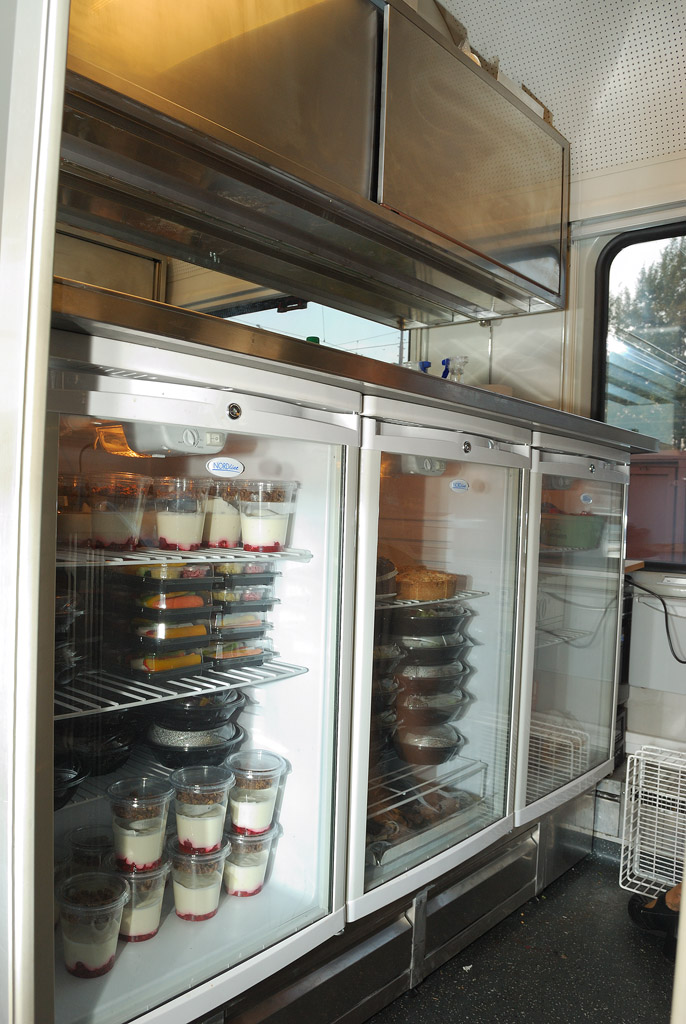 Fotografie nabízeného občerstvení nebudou - vzali jsme si k srdci slova pana ředitele a vše snědli. Co nás velmi příjemně oslovilo, byly ceny. Minimálně nealkoholické nápoje se nevyplatí kupovat na nádraží. I jídla jsou v porovnání se současností JLV a Wagon Slovakia o poznání levnější. Samotný RegioJet se netají téměř nebo zcela nákladovými cenami a nechává slyšet, že jedním z cílu společnosti je naučit lidi stravování ve vlacích. V současnosti jsou přesto možnosti omezené - pokud čekáte pořádný steak či řízek, musíte si počkat na dodávku plnohodnotných jídelních vozů z rumunské vagonky. V menu najdete spíše lehké občerstvení - sushi, saláty a deserty ke kávě nebo snídaňové menu s croissanty a jiným pečivem. Nic z ochutnaných jídel nebylo špatné. Na sushi boxy jsme měli dobré reference už od zaměstnanců RegioJetu a měli pravdu - je výborné. Káva zdarma je samozřejmostí stejně jako v autobusech Student Agency express. Z aktuálně nabízených piv je v nabídce Svijanský kníže 13° a Bernard nealko.