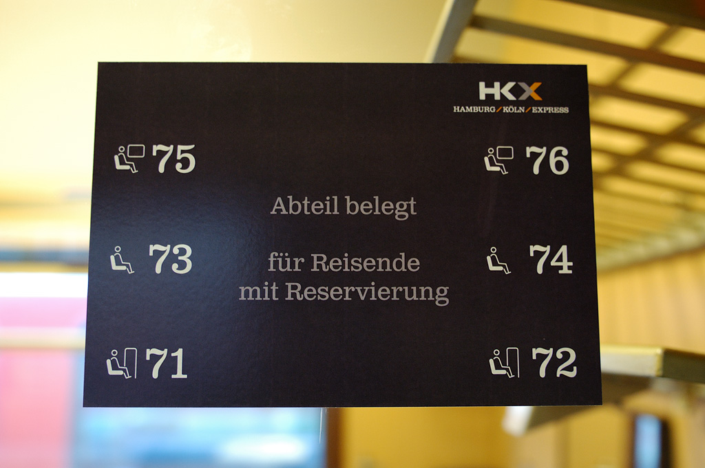 Rezervační systém HKX, foto: Josef Petrák Přijmete-li má měřítka porovnání, projekty IC RegioJet a LEO Express, pak dojem ze soupravy byl řekněme negativně-neutrální. Samozřejmě, že na palubě není žádnáť wifi síť, ale ta není v Německu vůbec standardem - odhlédneme-li od T-Mobile hotspotů na některých trasách ICE, které se postupně rozšiřují. Vozy vzhledem ke svému stáří postrádaly také zásuvky 230V a záchod byl na bázi gravitace bez retenčních nádraží, i když musím uznat, že toalety byly jako jediná část vozů nedávno zřejmě zrenovované. Co do prostoru jsou vozy Avmz něco, co snad nemá v Evropě konkurenci. Náš vlak byl obsazen odhadem z 40-50 % a registroval jsem i cestujícího, co si v šestimístném kupé provedl pohodlnou lůžkovou úpravu. Takového komfortu se mu asi za podobnou cenu u DB nedostane.