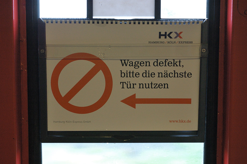 Kupé Avmz v ladění HKX, foto: Josef Petrák Značení nefunkčních dveří HKX, foto: Josef Petrák Interiér vozu Avmz HKX, foto: Josef Petrák HKX1800, Duisburg Hbf, 28. 7. 2012, foto: Josef Petrák Stevardka HKX, foto: Josef Petrák Vozy HKX, Köln Hbf, foto: Josef Petrák ES64U2-030, HKX1803, Köln Hbf, 28. 7. 2012, foto: Josef Petrák