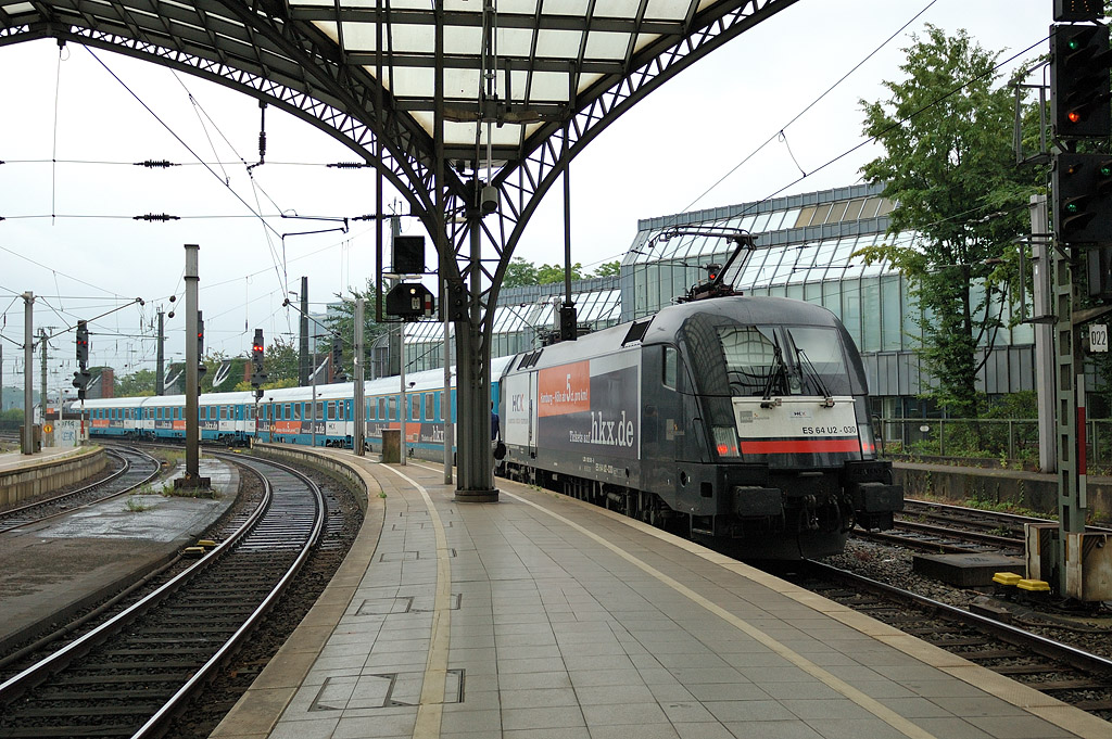 HKX1803, Köln Hbf, 28. 7. 2012, foto: Josef Petrák Hamburg-Köln-Express uzavřel kontrakt s německou Veolií, aby zajistila strojvedoucí a lokomotivy pro vlaky HKX. InterConnex patřící pod Veolii je ostatně jediným dopravcem v Německu, který provozuje komerční dálkové spoje. Jak už jsme zmínili, nasadily se stroje Siemens ES64U2 EuroSprinter. První čtyři dny provozu poskytla společnost jeden pár spojů mezi Kolínem a Hamburkem. Denně je v provozu pouze vlak HKX1803 v 12.01 z Kolína. Nejvíce spojů v serverním směru je v neděli - 3. V opačném směru jedou jeden až dva s tím, že v neděli jedou dva odpolední.