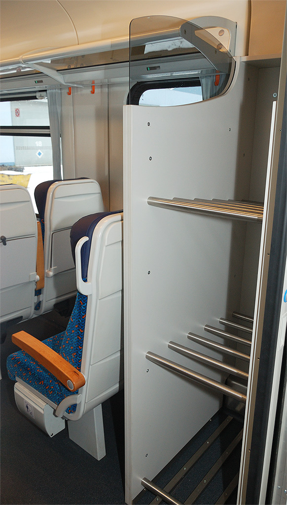 Modernizace řady Bmee posouvá tyto vozy technicky i morálně o více než generaci vpřed – vůz je vybaven dnes již standardními prvky, jakými jsou vakuové WC, klimatizace, zásuvka 230V pro každou dvojici sedadel, nebo audiovizuální informační systém s výhledem elektronických rezervací. Zcela novým doplněním interiéru jsou držáky pro čtyři jízdní kola, zatímco na protějším představku se nachází police pro nadměrná zavazadla. I přes vysokou kapacitu vozu je u sedadel relativní dostatek prostoru pro nohy. Naopak problém pro nohy může činit uchycení stolků u proti sobě orientovaných sedadel, kde je ukotvení na straně uličky zajištěno dvěma hranoly se šířkou shodnou se složenými deskami stolků. Navíc má toto uchycení, vzhledem k dlouhodobému vývoji, překvapivě ostré hrany. Police nad sedadly nabízí dostatek místa, a to i pro objemnější zavazadla. Samotná sedadla pocházejí od výrobce MSV Interiér, stejně jako v případě nedávno uvedených vozů Bbdgmee236, pocházejících z typově příbuzné řady vozů služebních. Dřevěné područky sedadel působí z designového hlediska působivě, bohužel praktičnost jejich použití je sporná. Područky jsou tvrdé, málo ergonomické a v neposlední řadě se na nich potí ruce. Sedadla v těchto vozech nebudou polohovatelná.