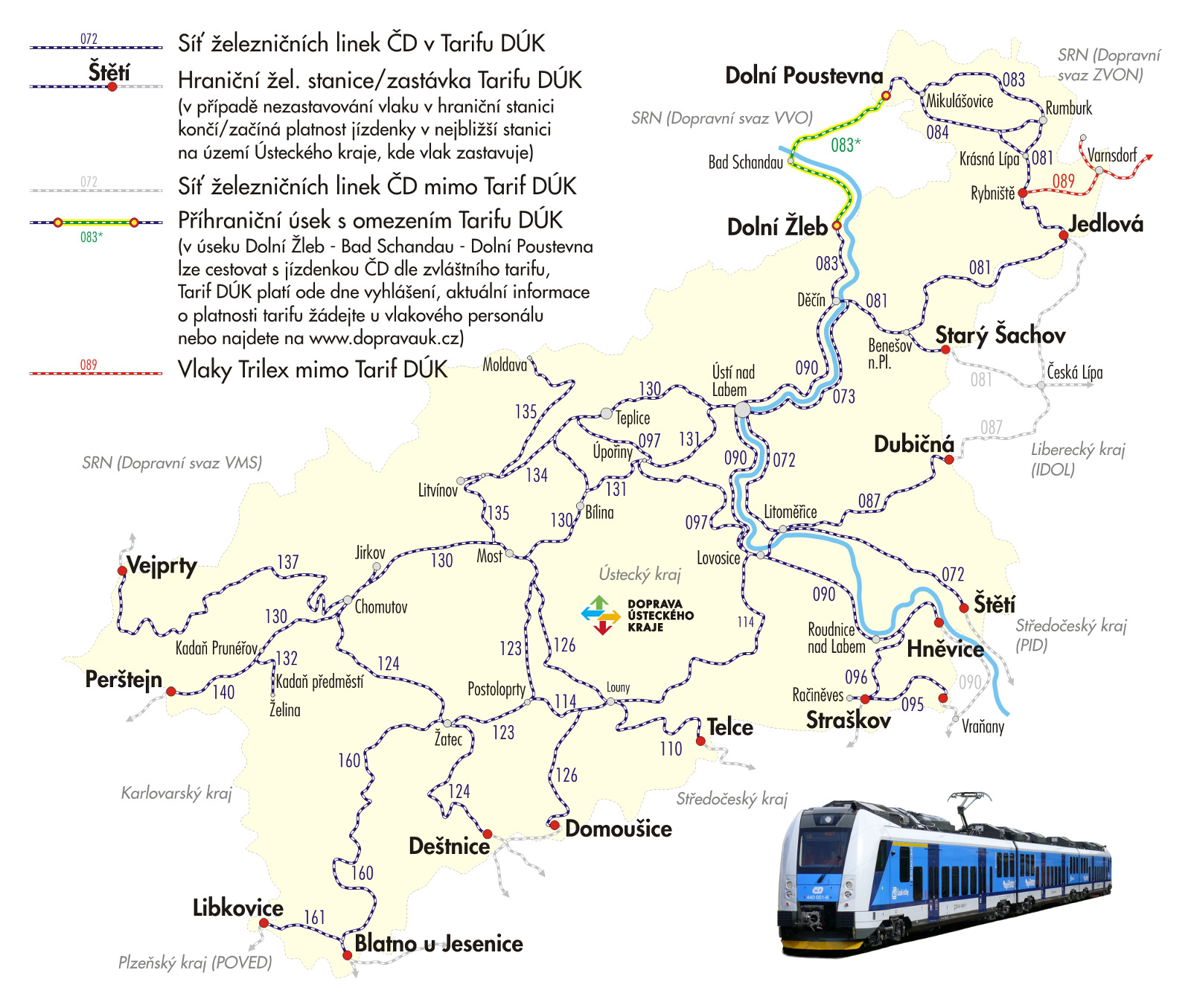 Celokrajský integrovaný dopravní systém byl v Ústeckém kraji spuštěn v roce 2015, jeho hlavní nevýhodou je zatím nezaintegrování většiny systémů MHD. Na jízdenku DÚK je možné cestovat v autobusech a trolejbusech pouze v Teplicích, a částečně v Ústí nad Labem. V dalších velkých městech kraje, včetně Mostu, Chomutova nebo Děčína lze prozatím použít pouze síťovou jízdenku Labe-Elbe. Ta vloni v prosinci mírně podražila a rovněž přestala platit ve vlacích EC a EN.