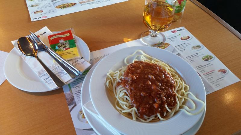 Po rychle ubíhající jízdě ve voze řady Bmz jsme brzy zastavili na hlavním nádraží v Berlíně, které prostě miluji. Ať už kvůli jeho podobě, či kvůli cvrkotu v několika patrech s obchody a s vlaky. Neodolal jsem lehké svačince v Pizza Hut (ano, je to nezdravé) a pak jsem zamířil na vlak ICE 1514 do stanice Hamburg-Altona. Rezervační systém mě nadělil místo proti směru jízdy u stolku zády k příčce oddělující první třídu od druhé. Po chvilce jsem si však odsedl na klasickou dvojsedačku po směru jízdy a musím konstatovat, že je zde na nohy více místa, než například ve voze Astra u Regiojetu. Wi-Fi za 5 euro jsem oželel a po kontrole jízdenek a průzkumu toalet jsem se vydal do bistrovozu. Zde panoval čilý ruch, občerstvení připravovali i zaměstnanci, kteří před chvílí kontrolovali jízdenky, zkrátka opravdu jeden tým. Během několika vteřin se přiřítila culící se slečna a přijala mojí objednávku na špagety s boloňskou omáčkou a jablečný střik. Zde se rozesmála, když jsem se marně snažil vyslovit „apflšorle“. Atmosféra v bistru byla příjemná a přátelská. Na výběr bylo z řady lokálních specialit, nicméně mě zajímalo, jak se zde popasují s těstovinami. Musím také podotknout, že se mi velmi líbí styl řekněme „prostírání“ příborů a celkově dalšího porcelánu. Na rozdíl od papírových kapsiček u JLV.