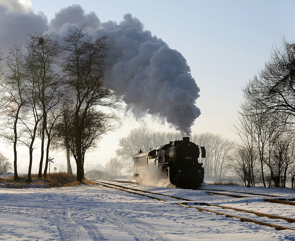 Všemi parními příznivci známé zátiší ve stanici Kněževes, kde ústí vlečka KHKD, dalo za vznik dalšímu záběru, který mě oslovil svojí promrzlou atmosférou. Asi je to náhoda, ale opět se do výběru dostal záběr od M. Švancara ze stejné jízdy. Zřejmě vydařená akce. Podobný záběr v protisvětle s mohutným sloupem kouře krásně vykresluje plasticitu onoho „baga“ a světlo prostupující mrazivým polednem umocňuje stíny stromů a jejich siluetu v dálavách. Poklidnou scenérii v malém nádražíčku nenarušuje žádný element moderní doby. Moje fantazie mi říká, co kdyby byla vidět v levém horním rohu silueta slunce procházející kouřem. To by byla přidaná hodnota. I tak je to krásný záběr.