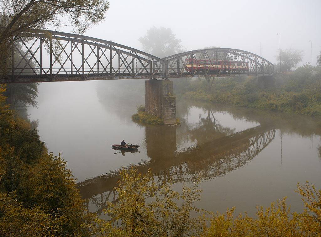 Telené čelovky mám rád, to je o mně asi známo. Tady se ale topičovi povedl přímo husarský kousek, najít místo takové, kde trať nahoře ubíhá až do vrcholu snímku. Absence oblohy a naopak vedení trati prakticky přes celý záběr podtrhuje symetrii, tolik typickou pro podobné záběry. U stejného autora zůstanu a připomenu jeho zátiší s rybářem. Při fotografování je dobré také občas odpoutat svou pozornost od vlaku jako takového a hledat kompoziční souvislosti. Samozřejmě je k tomu zapotřebí trošku toho štěstíčka, aby zrovna rybář seděl tam, kde stojí, ale o to přeci jde. A pak to vymyslet a nakomponovat, aby to ladilo.